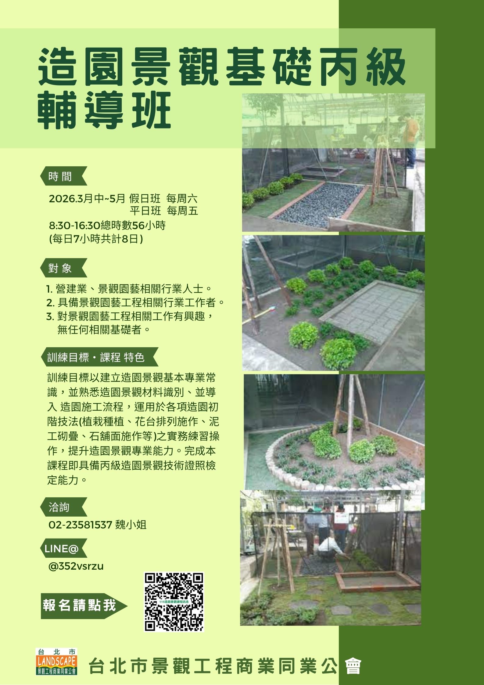 ■ 適合對象: 欲報考115年「造園景觀」職類丙級技術士技能檢定者皆適合參加本班。